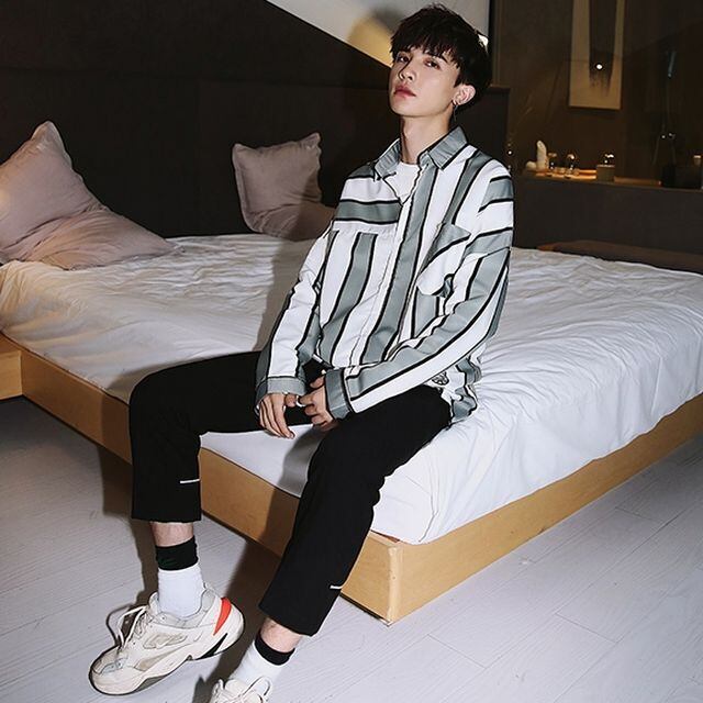 【予約販売】シャツ 長袖 ストライプ柄 メンズ アシンメトリー グレー ブルー カジュアル こなれ感 お洒落 韓国 トレンド 春 秋 S/M/L/XL/2XL