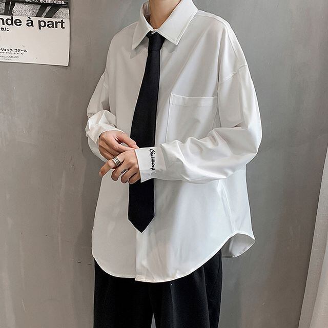 【予約販売】シャツ 長袖 無地 ベーシック ネクタイ付 メンズ 袖ロゴ ホワイト ブラック カジュアル こなれ感 お洒落 韓国 トレンド 春 秋 M/L/XL/2XL