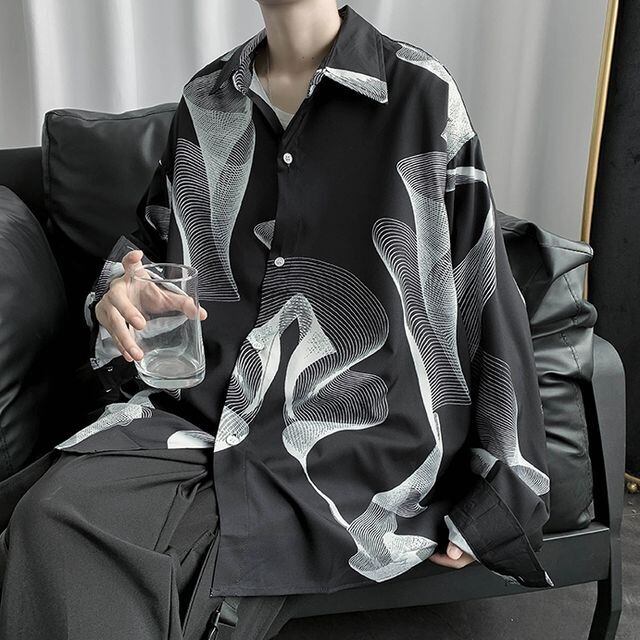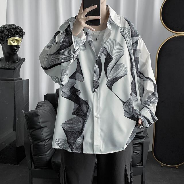 【予約販売】シャツ 長袖 総柄 モノトーン メンズ ホワイトブラック カジュアル こなれ感 お洒落 韓国 トレンド 春 秋 M/L/XL/2XL