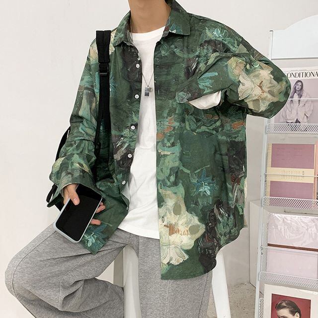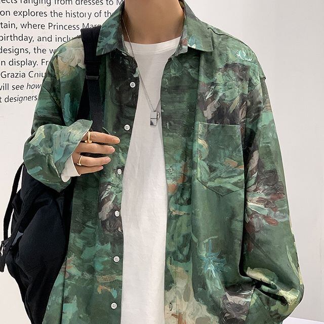 【予約販売】シャツ 長袖 総柄 メンズ グリーン カジュアル こなれ感 お洒落 韓国トレンド 春 秋 M/L/XL/2XL/3XL