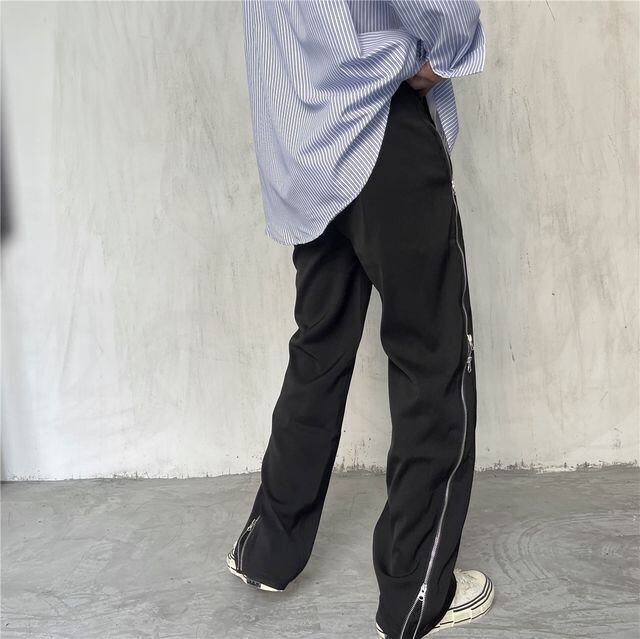 【予約販売】ストレートパンツ メンズ ボトムス サイドライン ジップ シンプル ブラック 黒 スタイリッシュ こなれ感 カジュアル 韓国 トレンド BTS グク 春 夏 秋 S/M/L/XL