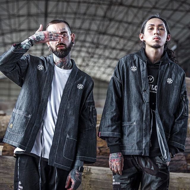 【予約販売】作務衣風コート メンズ 和風 刺繍 モダン ショート丈 デニム生地 七分袖 羽織 アウター 防寒 こなれ感 お洒落 韓国 トレンド 春 秋 冬 M/L/XL/2XL