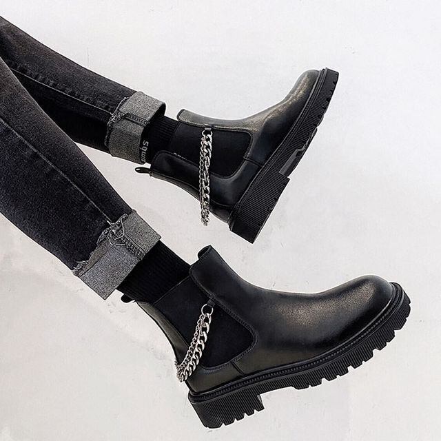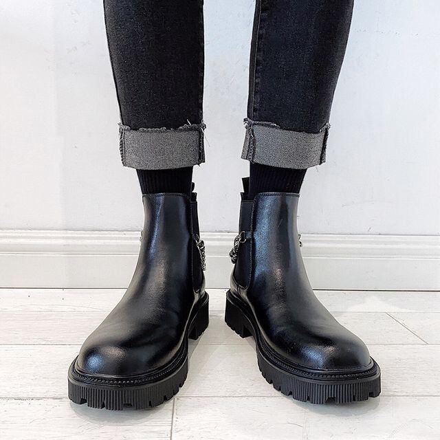 【予約販売】ブーツ 革靴 レザーシューズ メンズ サイドゴア チェーン シューズ 靴 厚底 ブラック お洒落 カジュアル シック 24cm/24.5cm/25cm/25.5cm/26cm/26.5cm