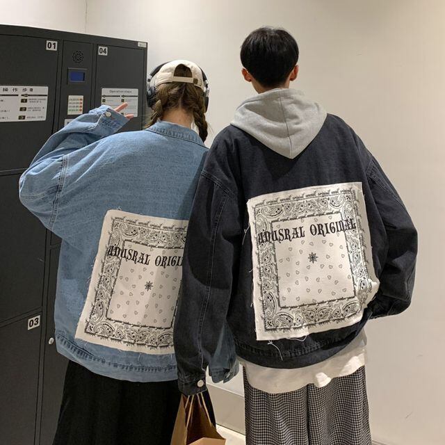 【予約販売】デニムジャケット ユニセックス バックプリント バンダナ柄 アウター ブルゾン ジージャン メンズ ユニセックス ブラック ブルー 防寒 お洒落 こなれ感 ベーシック 秋冬 お洒落 韓国 トレンド 春 秋 冬 S/M/L/XL/2XL
