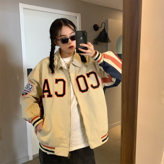 スタジャン レディース アウター ブルゾン レトロ 配色 おしゃれ ロゴ ベージュ/ネイビー M/L/XL