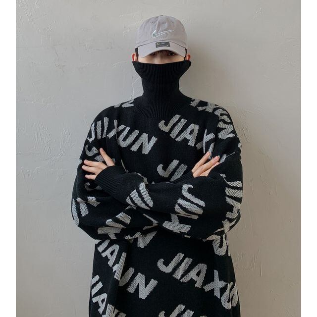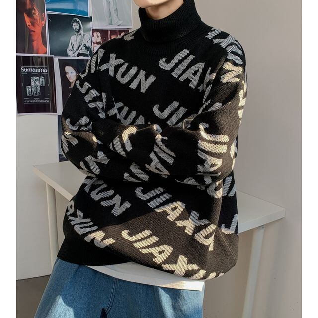 【予約販売】ニット タートルネック 総柄 ロゴ メンズ グリーン ブラック セーター こなれ感 お洒落 韓国 トレンド 秋冬 M/L/XL/2XL/3XL