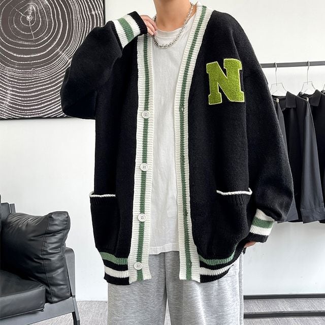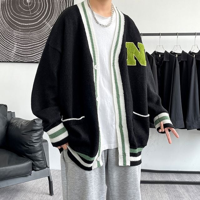 【予約販売】カーディガン ニット メンズ アウター N ライン オーバーサイズ ブラック クリーム カジュアル シック 防寒 男前 こなれ感 お洒落 韓国 トレンド 秋 冬 M/L/XL/2XL/3XL/4XL/5XL
