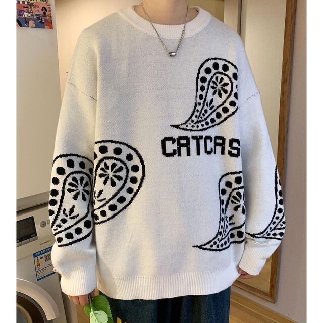 【予約販売】ニット ペイズリー柄 オーバーサイズ メンズ グリーン ホワイト ブラック セーター こなれ感 ストリート お洒落 韓国 トレンド 秋冬 M/L/XL/2XL/3XL