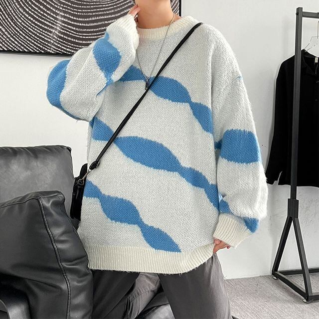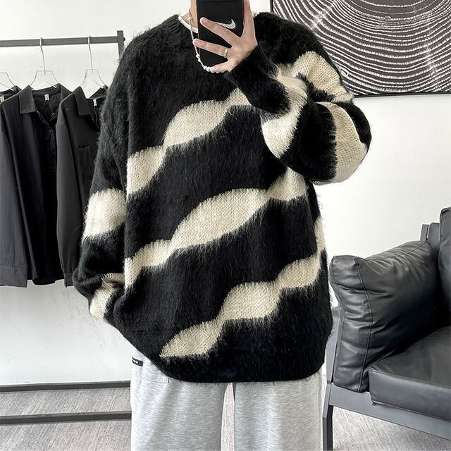 【予約販売】ニット モヘア 波柄 オーバーサイズ メンズ ホワイト ブラック セーター こなれ感 お洒落 韓国 トレンド 秋冬 M/L/XL/2XL/3XL/4XL/5XL