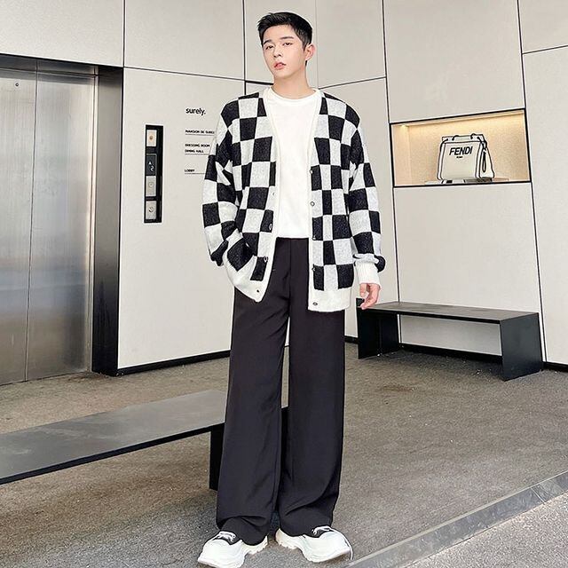【予約販売】カーディガン ニット メンズ アウター チェッカーフラッグ柄 チェック柄 モノトーン カジュアル シック 総柄 男前 こなれ感 お洒落 韓国 トレンド 秋 冬 M/L/XL
