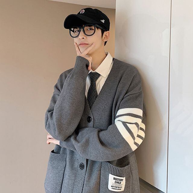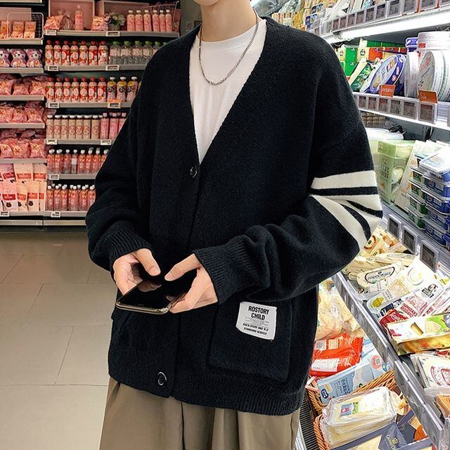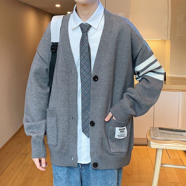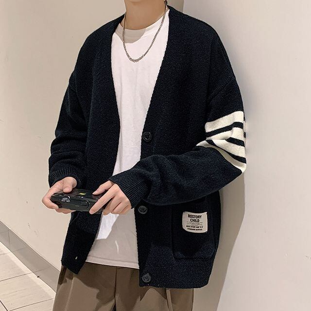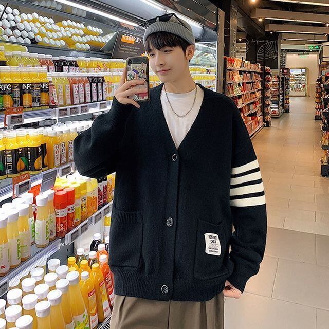 【予約販売】カーディガン ニット メンズ アウター カレッジ風 無地 ブラック グレー ライン カジュアル シック 総柄 男前 こなれ感 お洒落 韓国 トレンド 秋 冬 M/L/XL/2XL