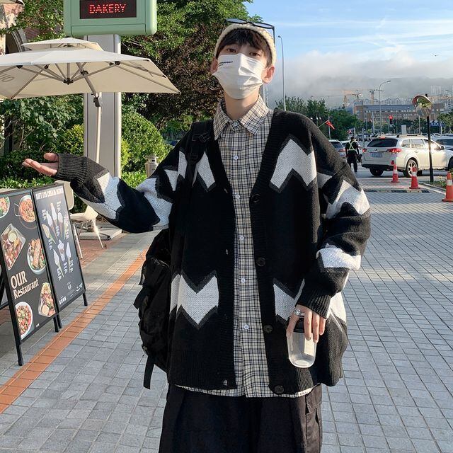 【予約販売】カーディガン ニット メンズ アウター ボーダー ブラック グレー ライン バイカラー カジュアル シック 総柄 男前 こなれ感 お洒落 韓国 トレンド 秋 冬 M/L/XL/2XL