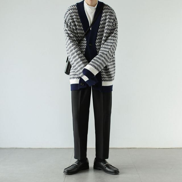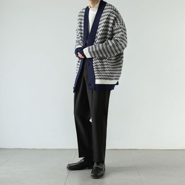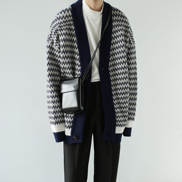 【予約販売】カーディガン ニット メンズ アウター Vネック 総柄 ネイビー グレー モード カジュアル シック 総柄 男前 こなれ感 お洒落 韓国 トレンド 秋 冬 M/L/XL
