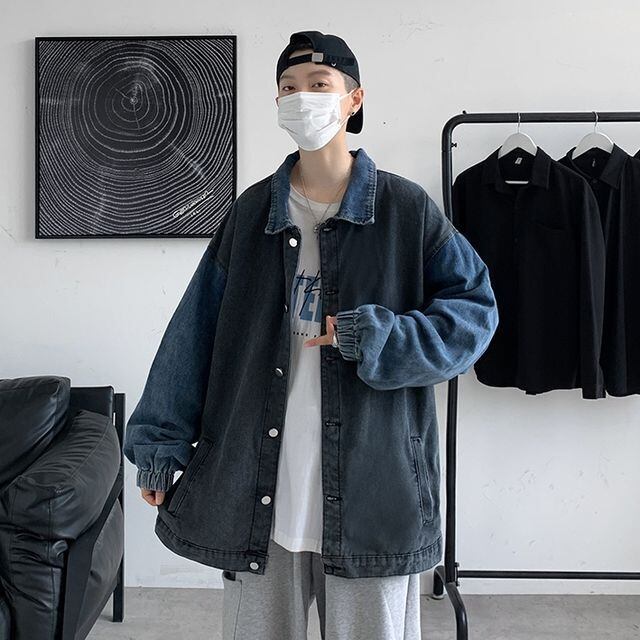 【予約販売】デニムジャケット Gジャン メンズ バイカラー 切り替え アウター ストリート オーバーサイズ ジージャン ブルー ブラック こなれ感 お洒落 韓国 トレンド 春 秋 冬 M/L/XL/2XL
