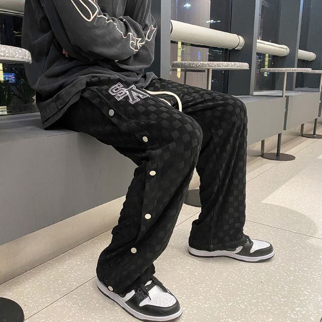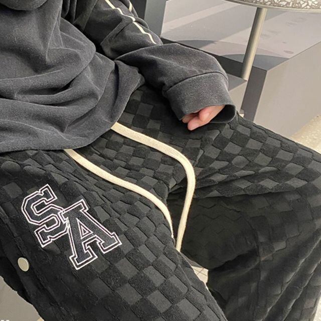 【予約販売】ワイドパンツ ボトムス スエット メンズ チェック ストリート ルーズストレート 刺繍 グレー ブラック カジュアル こなれ感 お洒落 韓国 トレンド 秋 冬 M/L/XL/2XL