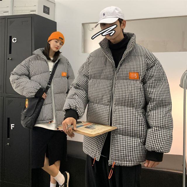 【予約販売】ダウンジャケット アウター ギンガムチェック柄 防寒 ブルゾン メンズ ユニセックス ショート丈 ストリート ブラック 防寒 お洒落 こなれ感 ベーシック 秋冬 大きいサイズ S/M/L/XL/2XL