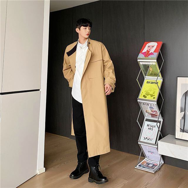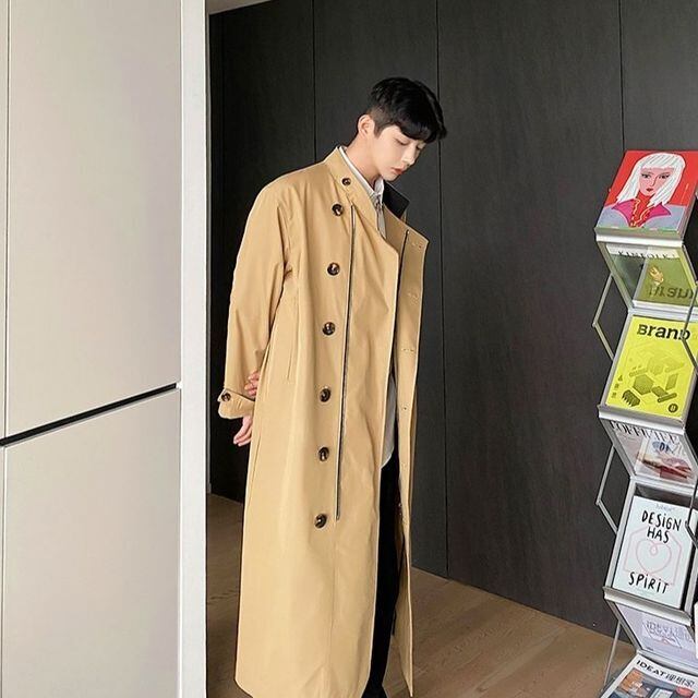 【予約販売】トレンチコート アシンメトリー ロング丈 メンズ ベージュ 無地 シンプル 男前 シック 韓国 オーバーサイズ 綺麗め 冬コート 防寒 ビジネス 通勤 防寒 お洒落 こなれ感 ベーシック 秋冬 大きいサイズ M/L/XL/2XL