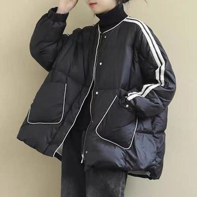 ダウンコート レディース アウター マフラーつき ホワイト ライン バイカラー オーバーシルエット ワンサイズ ブラック