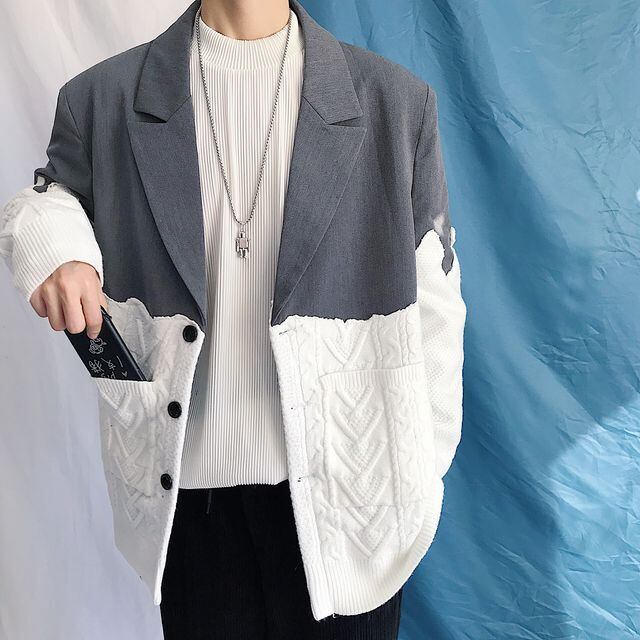 【予約販売】テーラードジャケット バイカラー 異素材 ニット ジャケット メンズ グレー カジュアル パーティー 結婚式 二次会 パーティー エレガント 韓国トレンド 大きいサイズ 春 秋 冬 M/L/XL