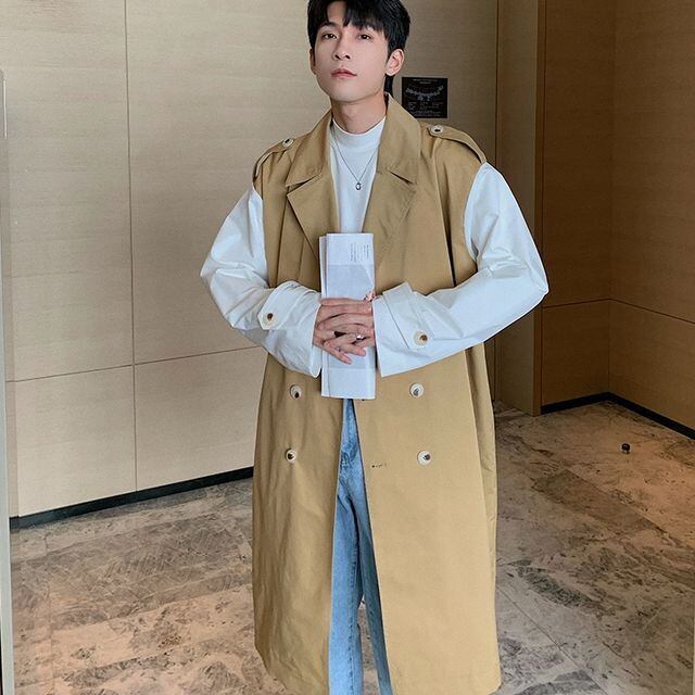 【予約販売】トレンチコート バイカラー 切り替え ミドル丈 メンズ ベージュ 無地 シンプル 男前 シック 韓国 オーバーサイズ 綺麗め 冬コート 防寒 ビジネス 通勤 防寒 お洒落 こなれ感 ベーシック 秋冬 大きいサイズ M/L/XL