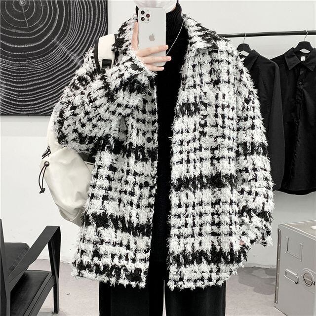 【予約販売】ジャケット チェック柄 ショート丈 アウター メンズ モノトーン シック カジュアル こなれ感 お洒落 韓国トレンド 大きいサイズ M/L/XL