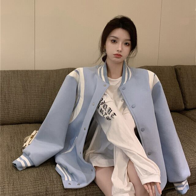 スタジャン アウター レディース ストリート メンズライク ベーシック シンプル おしゃれ パステルカラー ライン ブルー S/M/L
