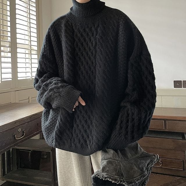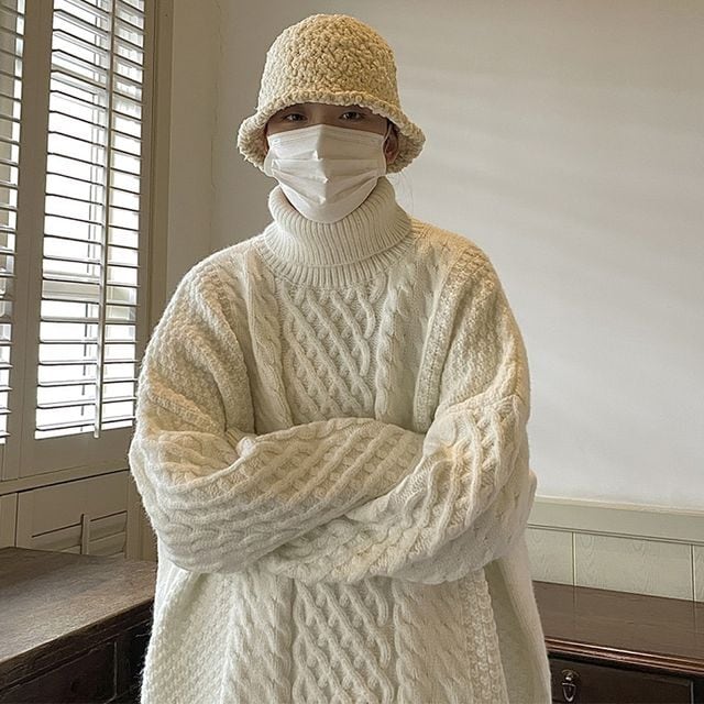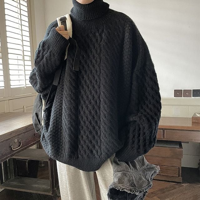 【予約販売】タートルネック ニット セーター メンズ ケーブルニット ハイネック ビッグシルエット ブラック ホワイト ブルー カジュアル シック 男前 こなれ感 お洒落 韓国 トレンド 秋 冬 M/L/XL/2XL