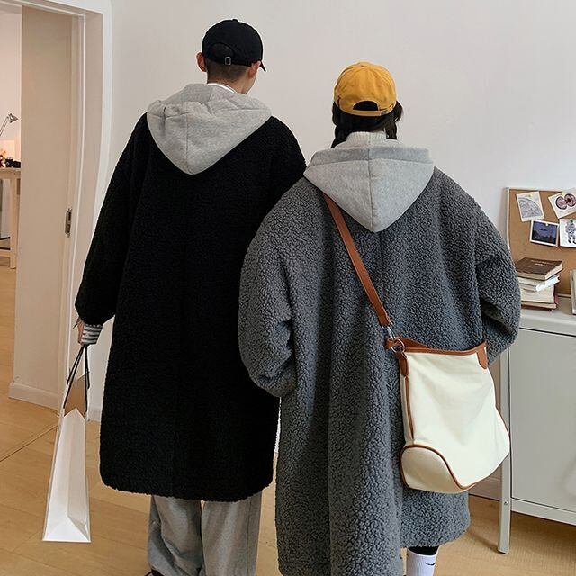 【予約販売】ボアコート フード付 アウター レイヤード ロング丈 防寒 メンズ レディース ユニセックス ストリート ブラック グレー 防寒 お洒落 こなれ感 ベーシック 秋冬 大きいサイズ M/L/XL/2XL/3XL/4XL/5XL