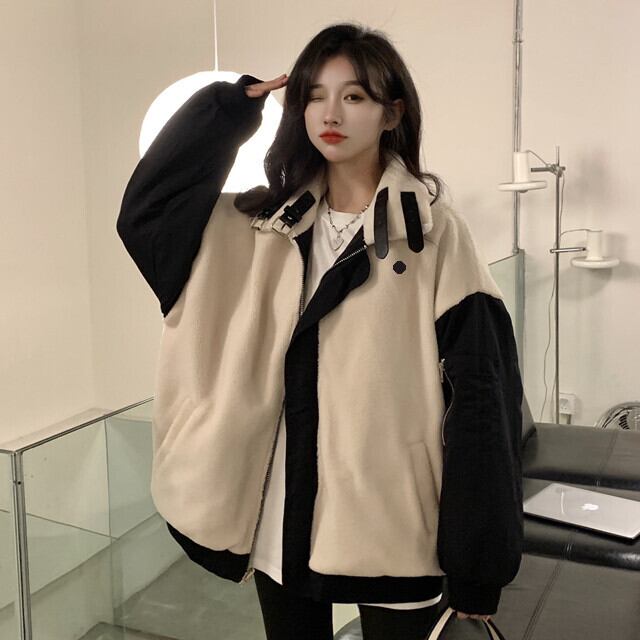 スタジャン レディース アウター 防寒 あったかい リバーシブル ベルト ロゴ バイカラー ブラック/カーキ S/M/L/XL