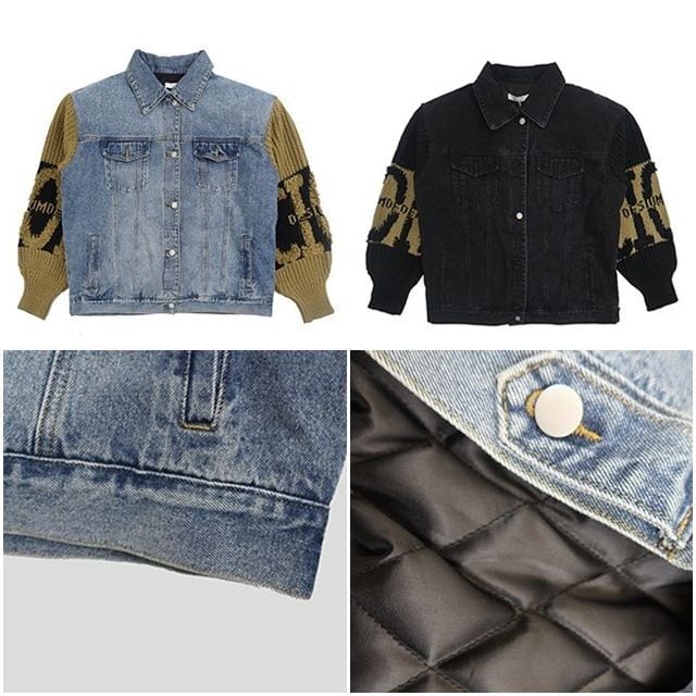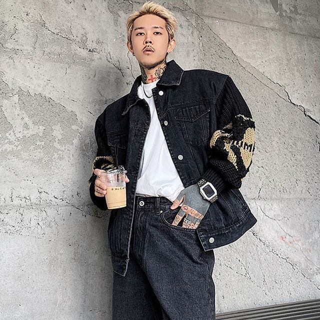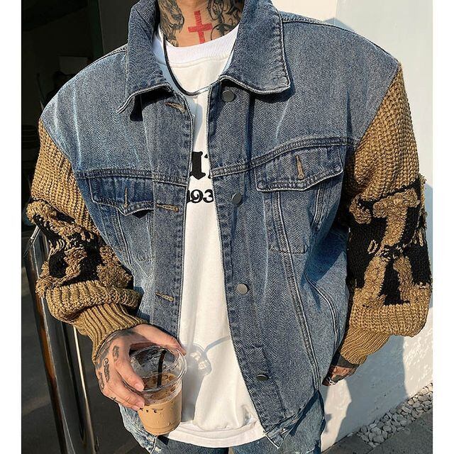 【予約販売】デニムジャケット ニット アウター ショート丈 異素材MIX 防寒 メンズ シンプル 無地 ストリート ブラック ブルー 防寒 お洒落 こなれ感 ベーシック 秋冬 大きいサイズ M/L/XL