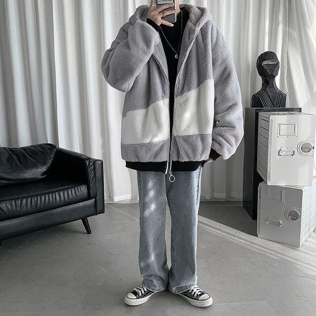 【予約販売】ボアブルゾン メンズ バイカラー フード付 モノトーン ショート丈 ビッグシルエット オーバーサイズ グレー ホワイト コート ジャケット 防寒 お洒落 こなれ感 ベーシック 秋冬 大きいサイズ M/L/XL/2XL
