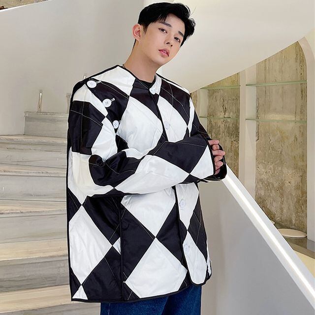 【予約販売】ジャケット メンズ ブラック ノーカラー 黒 イエロー ダイヤ柄 ボタン 個性的 アウター ショート丈 こなれ感 防寒 お洒落 カジュアル ベーシック 秋冬 大きいサイズ M/L/XL