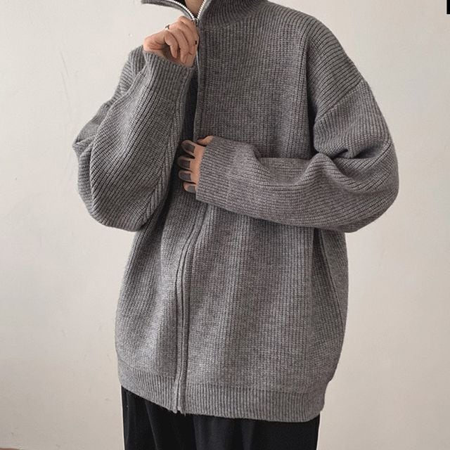 【予約販売】タートルネック ニット セーター メンズ カーディガン ジッパーデザイン ジップアップ ハイネック ビッグシルエット グレー ブラック ブラウン ホワイト カジュアル シック 男前 こなれ感 お洒落 韓国 トレンド 秋 冬 M/L/XL/2XL