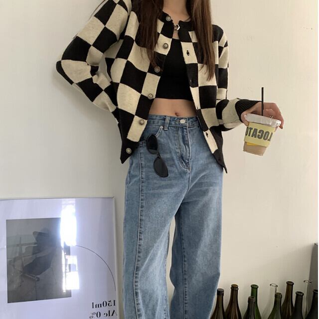 カーディガン ニット レディース トップス おしゃれ チェック柄 あったか 一枚映え こなれ感 カジュアル ブラック×ホワイト