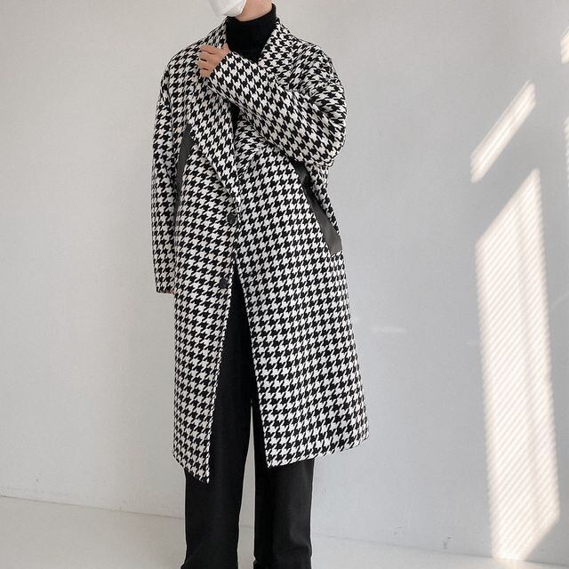 【予約販売】トレンチコート 千鳥格子柄 モノトーン メンズ アウター コート サイドライン ロング丈 防寒 お洒落 こなれ感 ベーシック 秋冬 大きいサイズ M/L/XL