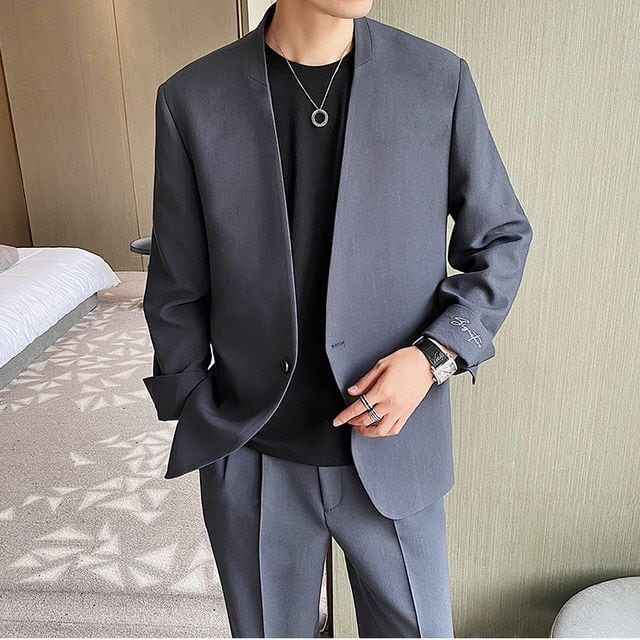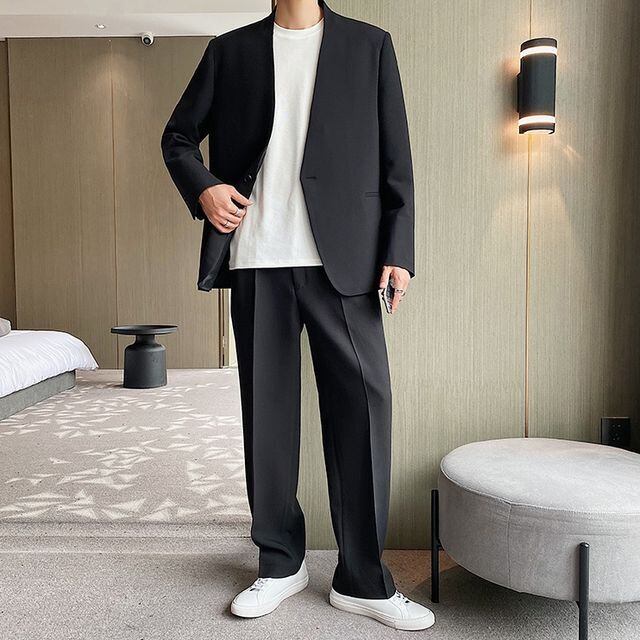 【予約販売】メンズ セットアップ スーツ ノーカラー 袖 ロゴ シック スリム Vネック きれいめ 男前 グレー ブラック フォーマル ジャケット パンツ セット セットアップ パーティ 二次会 同窓会 結婚式 韓国 トレンド 大きいサイズ S/M/L/XL
