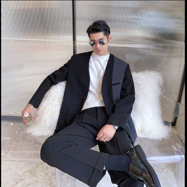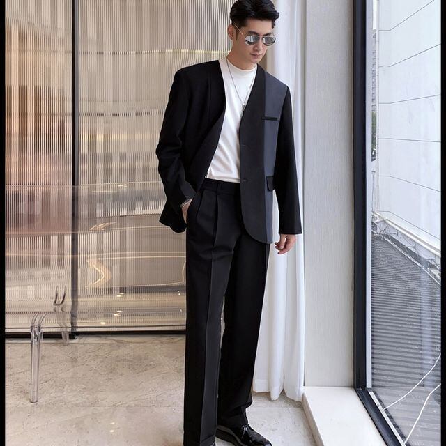 【予約販売】メンズ セットアップ スーツ ノーカラー バイカラー ツートン シック スリム Vネック きれいめ 男前 グレー ブラック フォーマル ジャケット パンツ セット パーティ 二次会 同窓会 結婚式 韓国 トレンド 大きいサイズ S/M/L/XL/2XL