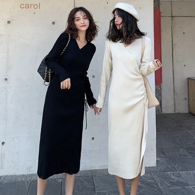 ワンピース レディース ロングワンピ ニットワンピ Vネック カシュクール くびれ ミモレ丈 シンプル スリット セクシー ベーシック リブ アプリコット/ブラック S/M/L/XL