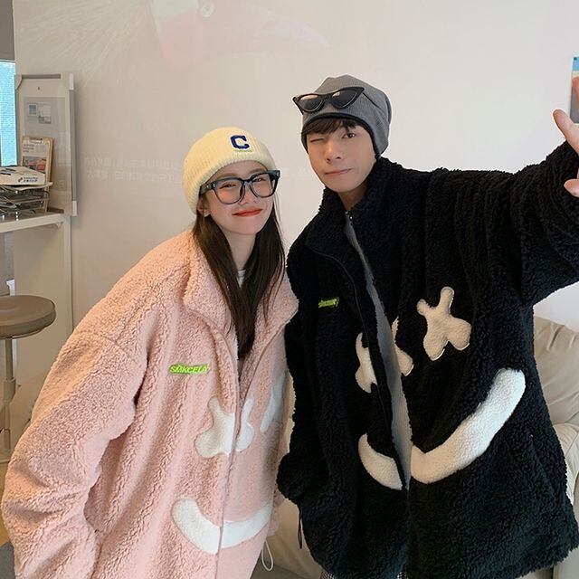 【予約販売】ボアジャケット アウター 防寒 ブルゾン メンズ ユニセックス ストリート スマイル ブラック ピンク ベージュ 防寒 お洒落 こなれ感 ベーシック 秋冬 大きいサイズ M/L/XL/2XL/3XL