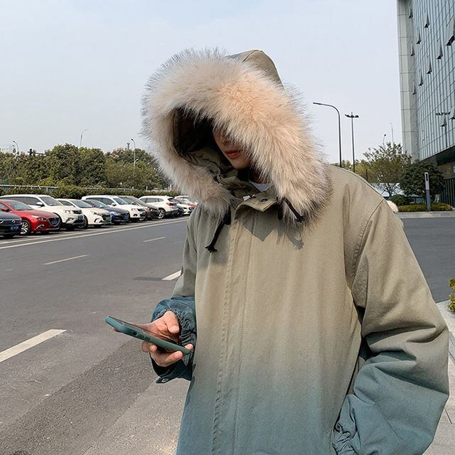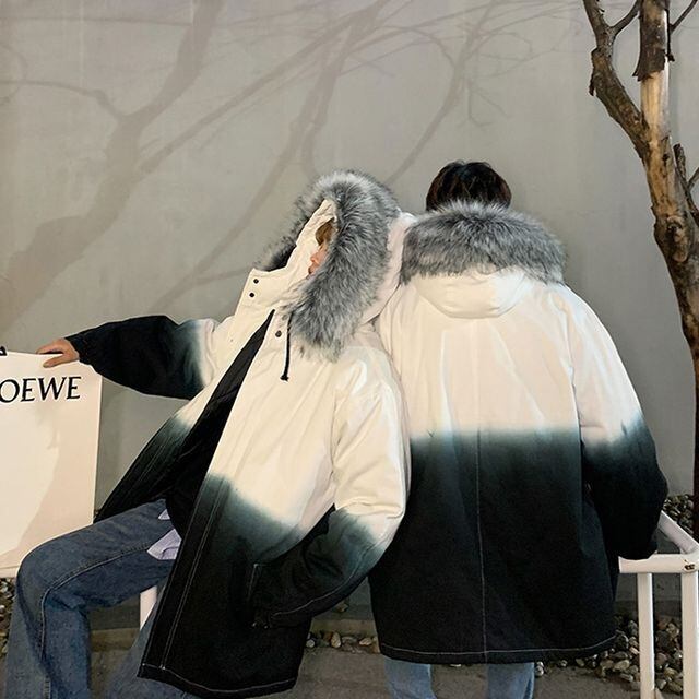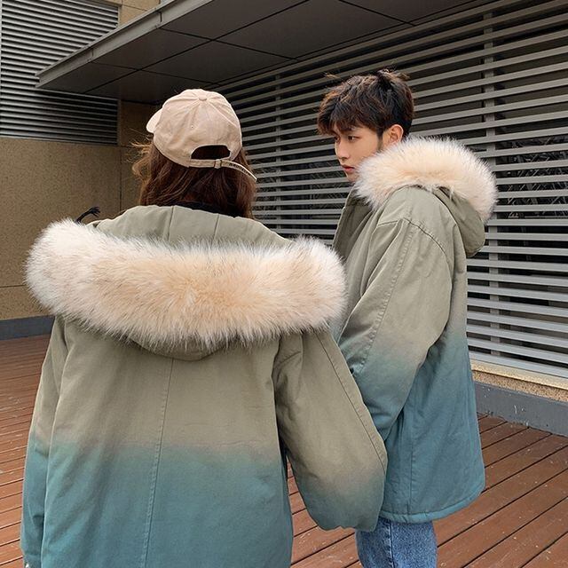 【予約販売】ジャケット アウター ファーフード グラデーション ショート丈 韓国 防寒 メンズ レディース ユニセックス ストリート ホワイト カーキ 防寒 お洒落 こなれ感 ベーシック 秋冬 大きいサイズ M/L/XL/2XL/3XL/4XL/5XL