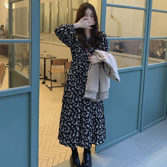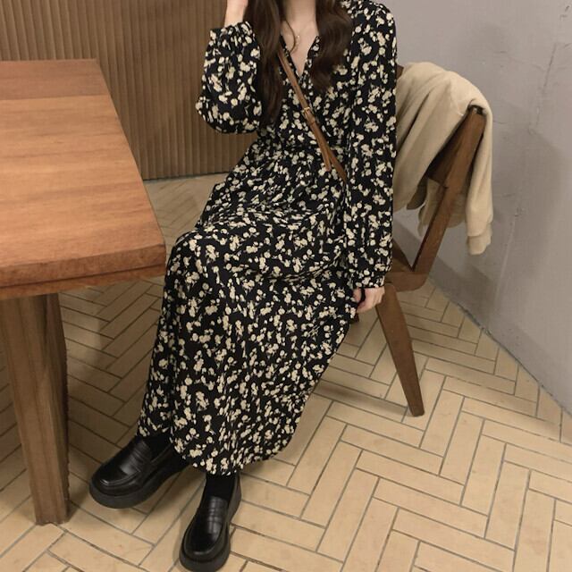 ワンピース レディース ロング丈 マキシワンピ 総柄 花柄 フラワー Vネック シフォン ブラック おしゃれ こなれ感 トレンド かわいい フェミニン S/M/L