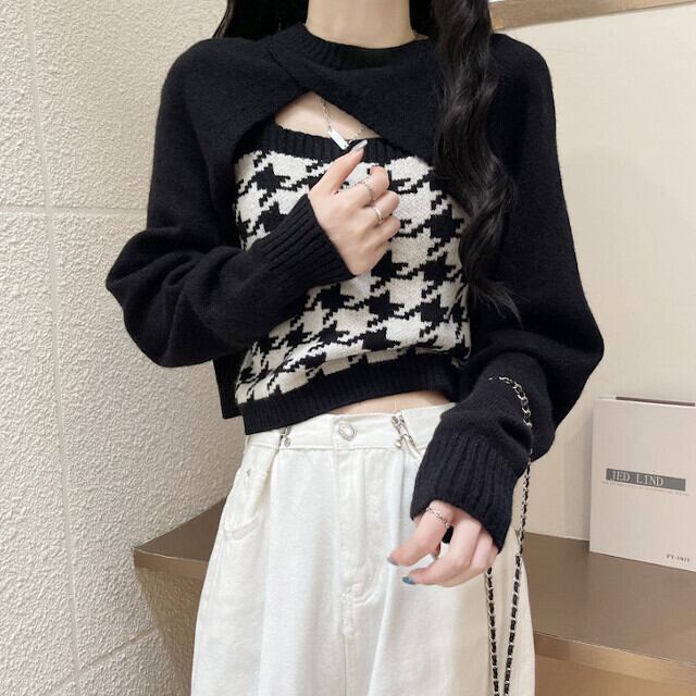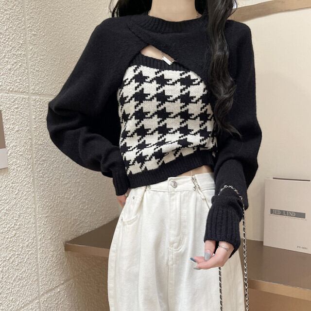 ニット カーディガン レディース トップス 変形 アシンメトリー おしゃれ 千鳥格子 ブラック/グレー/ブラウン/アプリコット S/M/L