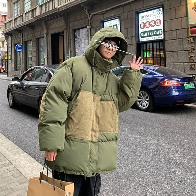【予約販売】ダウンジャケット メンズ 無地 フード付き 異素材MIX コーデュロイ アウター カーキ グリーン ショート丈 防寒 お洒落 こなれ感 ベーシック 秋冬 大きいサイズ M/L/XL