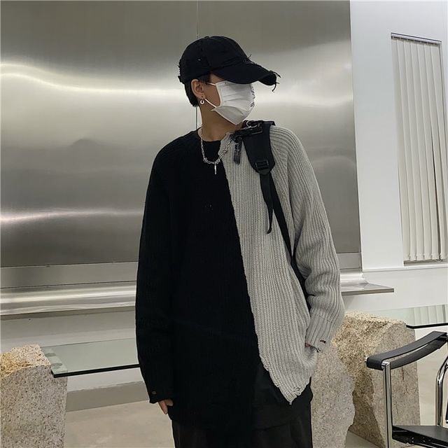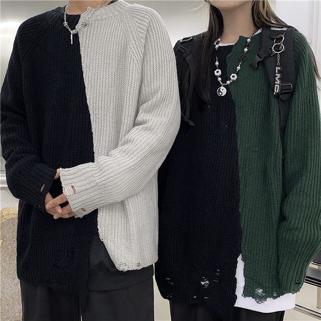 【予約販売】ニット ユニセックス セーター バイカラー ペアアシンメトリー ペア お揃い カップル ラウンドネック グリーン グレー オーバーサイズ メンズ レディース シンプル こなれ感 ストリート お洒落 韓国 トレンド 秋冬 フリー