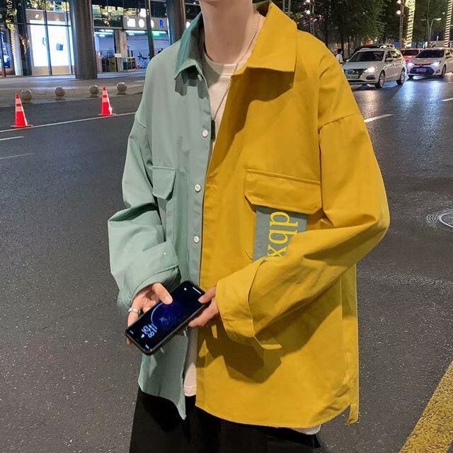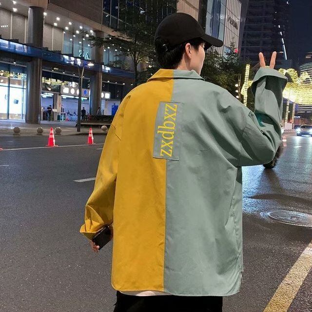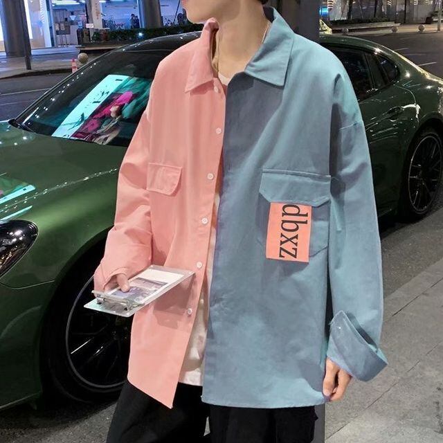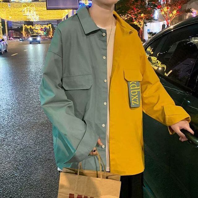 【予約販売】シャツ 長袖 バイカラー メンズ オーバーサイズ ブラック ブルー グリーン アシメ カジュアル ストリート こなれ感 お洒落 韓国 トレンド 秋冬 M/L/XL/2XL
