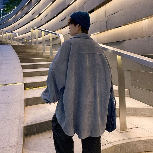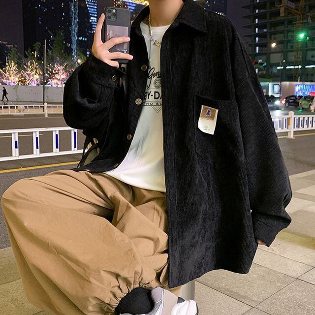 【予約販売】シャツ 長袖 コーデュロイ メンズ オーバーサイズ タグ ブラック カーキ グレー カジュアル ストリート こなれ感 お洒落 韓国 トレンド 秋冬 M/L/XL/2XL