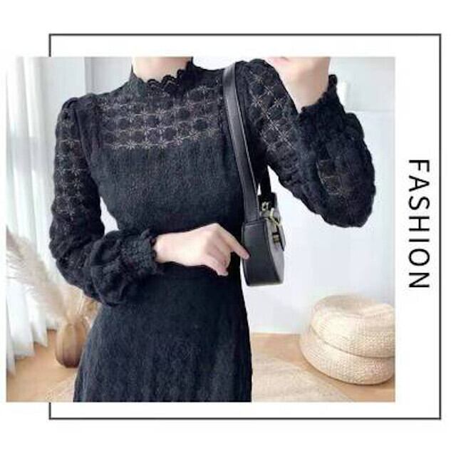 ワンピースドレス レディース ロング丈 ミモレ丈 長袖 ハイネック 詰襟 オフホワイト/ブラック S/M/L/XL
