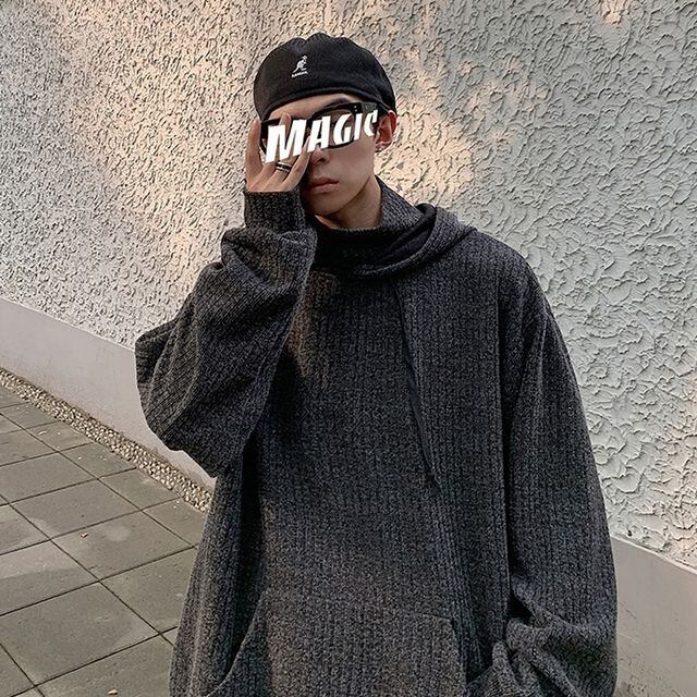 【予約販売】パーカー ニット セーターレイヤード ハイネック シンプル 長袖 メンズ ブラック グレー 無地 カジュアル こなれ感 お洒落 韓国 トレンド 冬秋冬春 S/M/L/XL/2XL