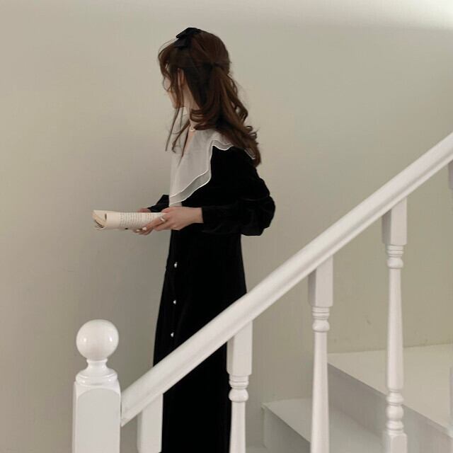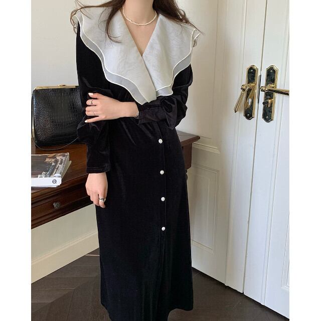 ワンピースドレス レディース ロングワンピ マキシ丈 ロング丈 ベルベット 襟付き Vネック 長袖 ブラック S/M/L