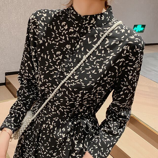 ワンピース ドレス レディース ワンピース シフォン 長袖 詰襟 Aライン ミドル丈 ミモレ丈 ひざ下丈 ブラック 花柄 S/M/L/XL